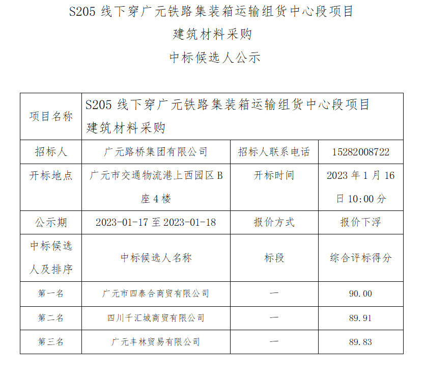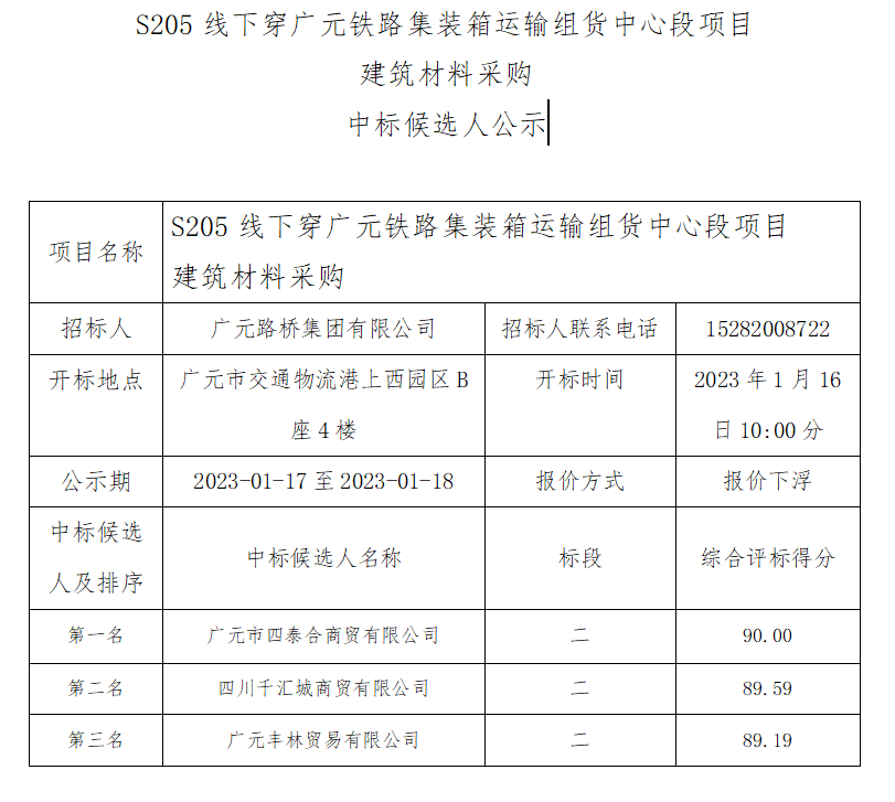 廣元路橋集團(tuán)有限公司S205線下穿廣元鐵路集裝箱運(yùn)輸 組貨中心段項(xiàng)目建筑材料采購中標(biāo)候選人公示